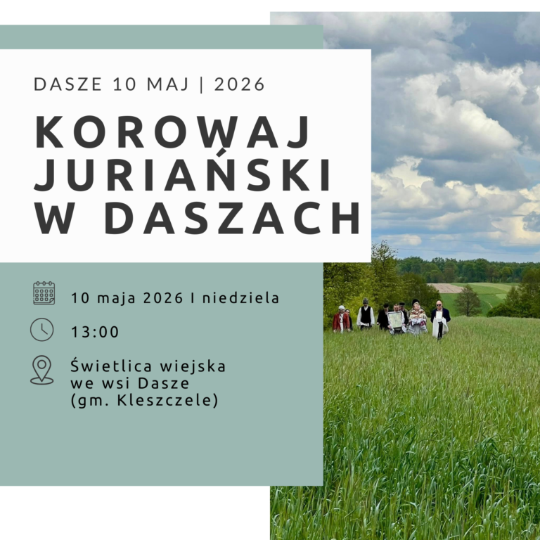Korowaj Juriański w Daszach 10 maja @ 13:00 – 16:00 „Jak na gromnicy piweń napijetsia wodicy, to na Juria wół najetsia trawicy”- przysłowie lokalne Dzień św. Jerzego Zwycięzcy – święto obchodzone jest przez kościół katolicki 23 kwietnia, zaś cerkiew prawosławną – jako Jurija –…